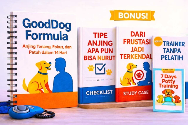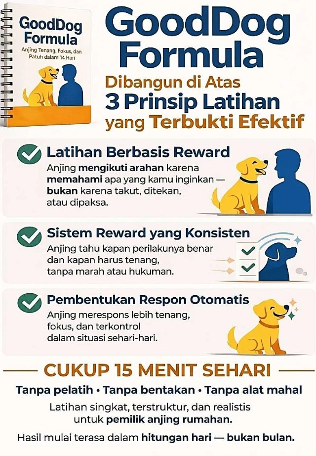 Yang bikin berubah adalah aturan rumah + rutinitas + respon kamu yang konsisten. Itu yang dibangun di Good Dog Formula, langkah demi langkah.